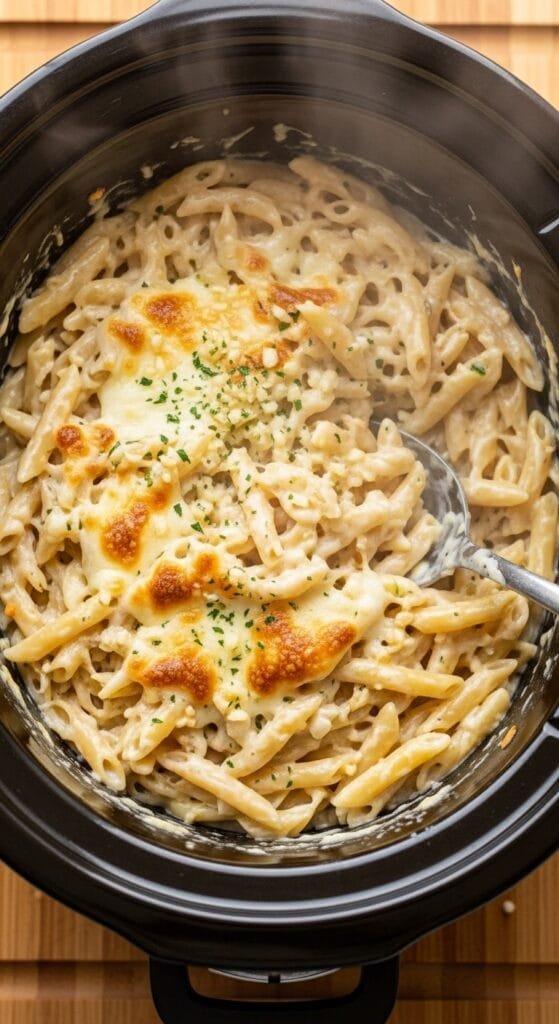 Unlike stovetop Alfredo that requires whisking and monitoring, the crockpot gently simmers everything together, letting the sauce thicken naturally. You don’t need advanced cooking skills — just a few pantry ingredients and about five minutes of prep.