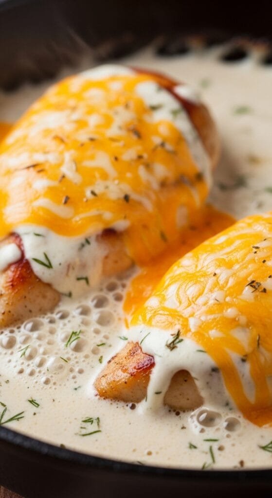 Season the chicken evenly, then sear briefly in a skillet until lightly golden. Prepare the creamy ranch sauce separately and pour it over the chicken. Reduce the heat and allow everything to simmer gently until the chicken is fully cooked through and reaches safe internal doneness, with a firm but tender texture. Finish by adding shredded cheddar cheese near the end, allowing it to melt smoothly into the sauce before serving.
