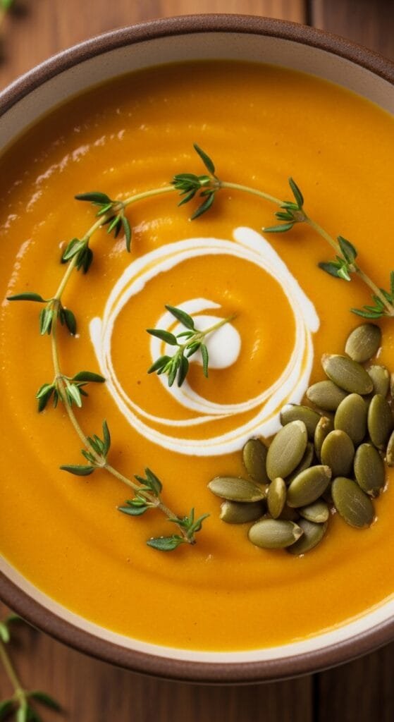 Top with pumpkin seeds, cream swirl, thyme, or fresh herbs.