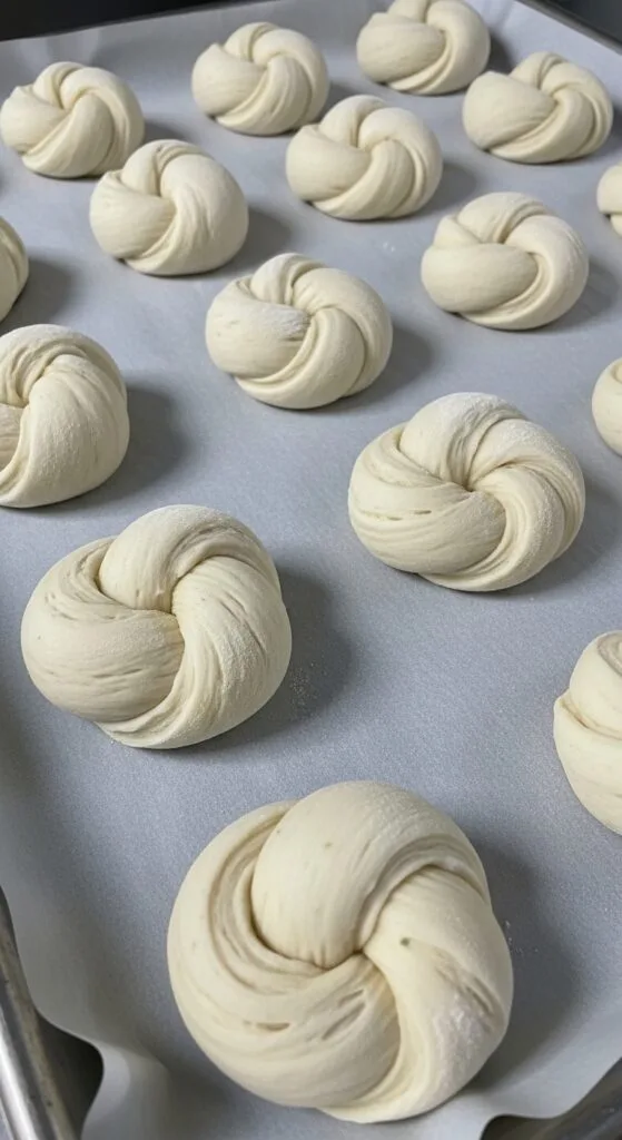 Place knots on lined baking sheets, cover loosely, and rest 30–45 minutes.
