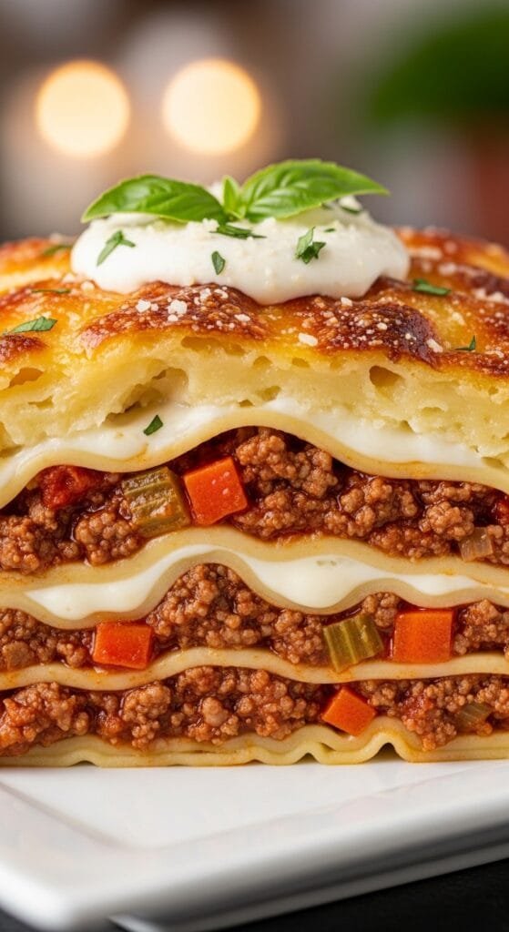 Traditional Bolognese uses ragu + béchamel instead of ricotta and mozzarella. It’s lighter, creamier, and focuses on slow-cooked flavor rather than heavy cheese layers.