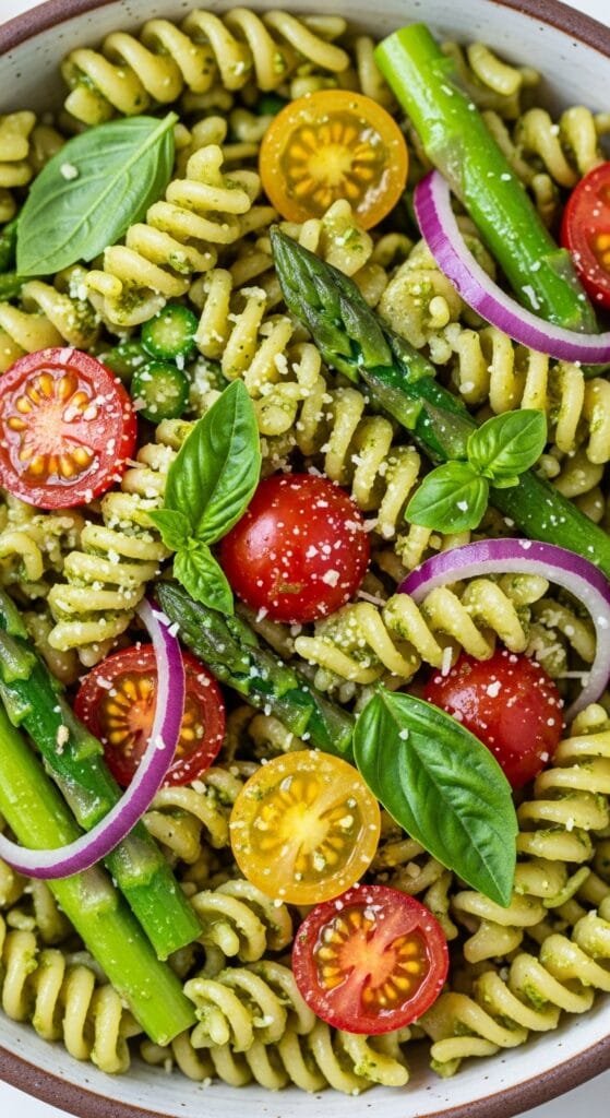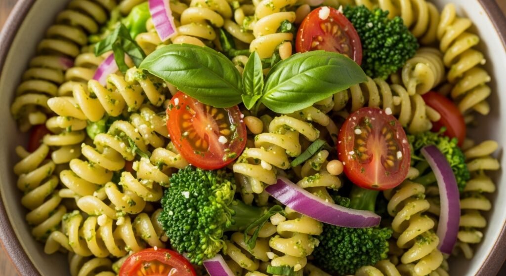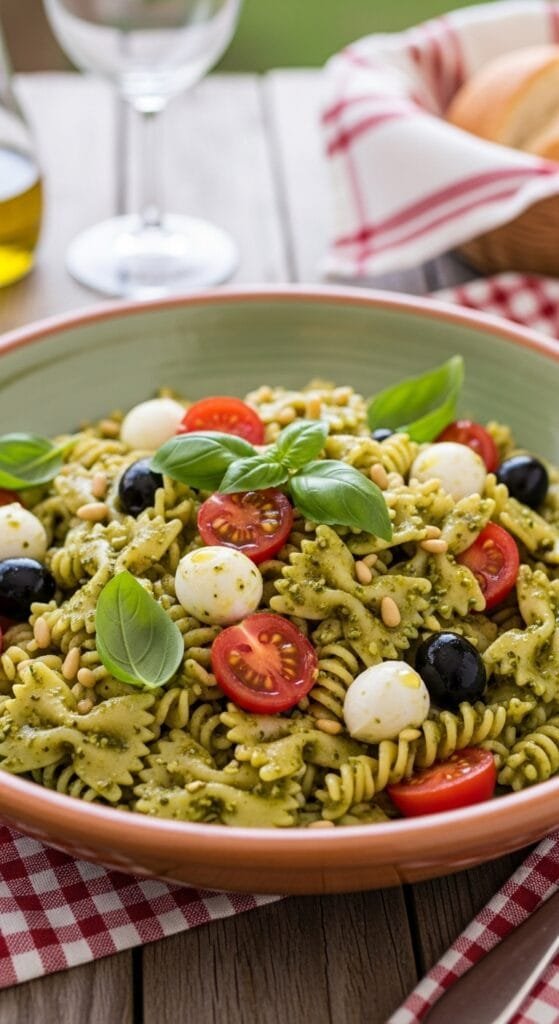 Pesto pasta salad is extremely versatile, making it perfect for casual meals or summer entertaining. Serve it chilled or at room temperature for the best texture. As a main dish, pair it with grilled chicken, salmon, shrimp, or roasted vegetables. As a side dish, it complements BBQ favorites like burgers, hot dogs, grilled steak, kebabs, or sandwiches. For gatherings, present it in a large bowl with extra basil, Parmesan shavings, or a drizzle of olive oil for a fresh, vibrant look. It also packs well for lunches, picnics, meal prep, or potluck tables.