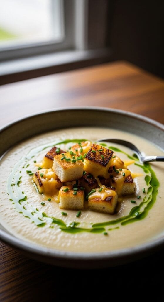 This Roasted Garlic Potato Soup with Grilled Cheese Croutons is the kind of meal that makes any chilly day feel warmer and more comforting. With its creamy texture, deep roasted-garlic flavor, and those irresistible golden croutons, it delivers pure homemade coziness in every bowl. It’s simple enough for busy weeknights yet special enough to serve on weekends or when hosting friends. Whether you enjoy it as a complete meal or pair it with a fresh salad, this recipe brings together rustic comfort and nostalgic flavors. Save it, share it, and enjoy every creamy, cheesy, garlicky spoonful!