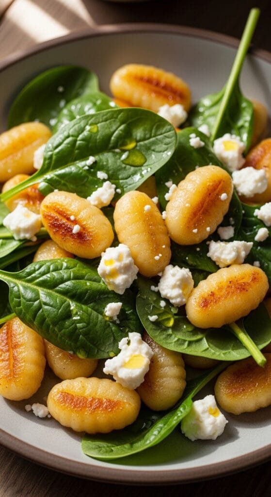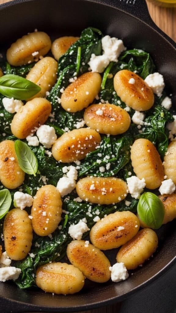 This method changes everything. Roasting removes excess moisture, intensifies flavor, and creates a texture that skillet or creamy gnocchi recipes can’t match. Tossed with olive oil, simple seasonings, and finished with wilted spinach and crumbled feta, this dish feels comforting without being heavy or rich.