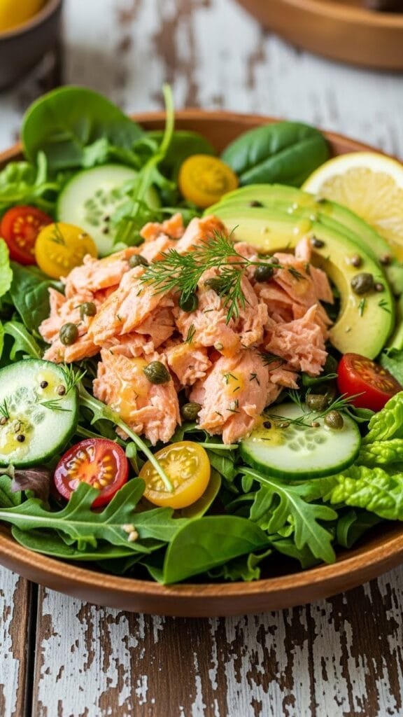 Salmon provides high-quality protein and omega-3 fatty acids, which support heart and brain health. Using a small amount of mayonnaise keeps the salad satisfying without being overly heavy.
