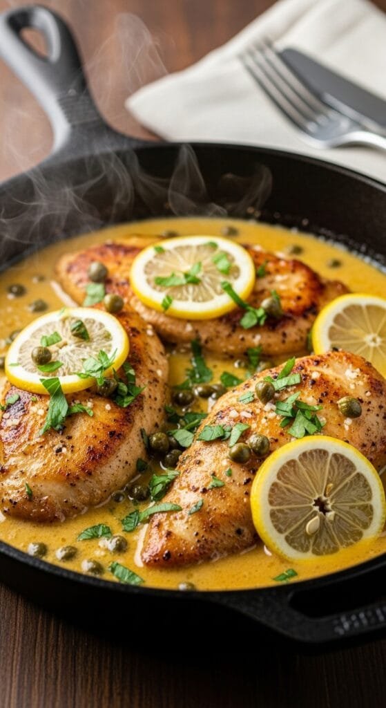 It’s inspired by classic piccata but slightly simplified for home cooking. The core flavors—lemon, capers, butter—are the same, but the sauce is designed to be smoother and more forgiving.