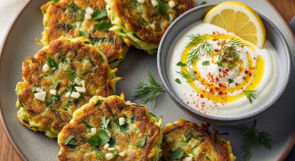 Golden Zucchini Fritters with a Zesty Lemon Yogurt Dip